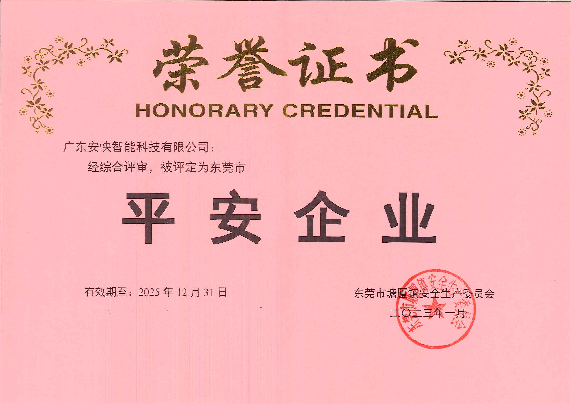 平安企業(yè)榮譽(yù)證書